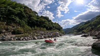 2艇に分乗して中級コースに行きます。 立って乗って下るよ! 普通に波大きくてオススメ。 NHKの番組「あんぱん」の舞台に…